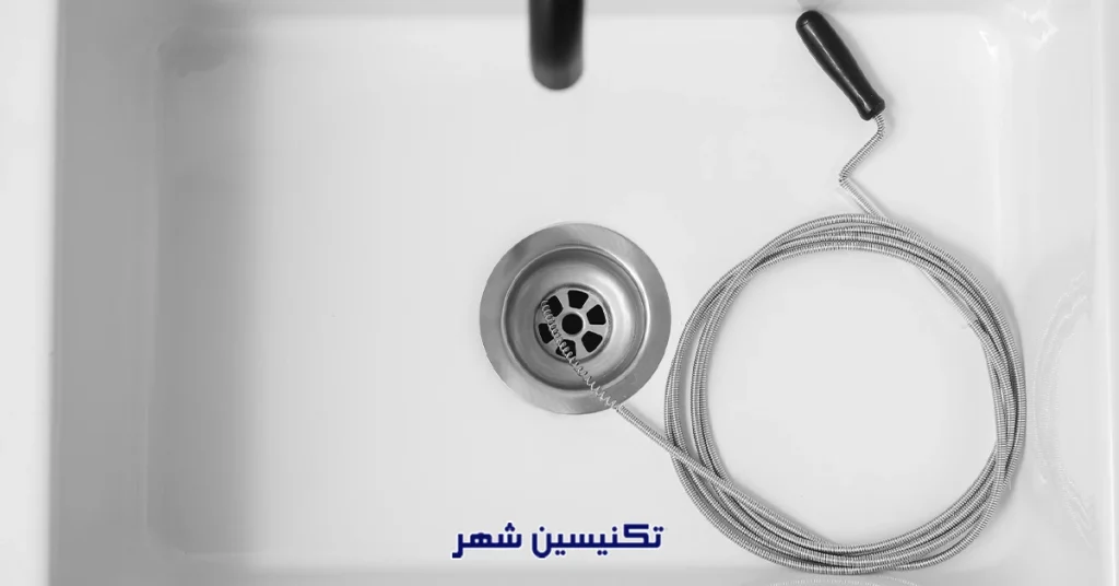 استفاده از دستگاه فنری: یک فنر لوله بازکن را به داخل لوله فرو کنید تا موها و مواد گیر کرده را بیرون بیاورد.